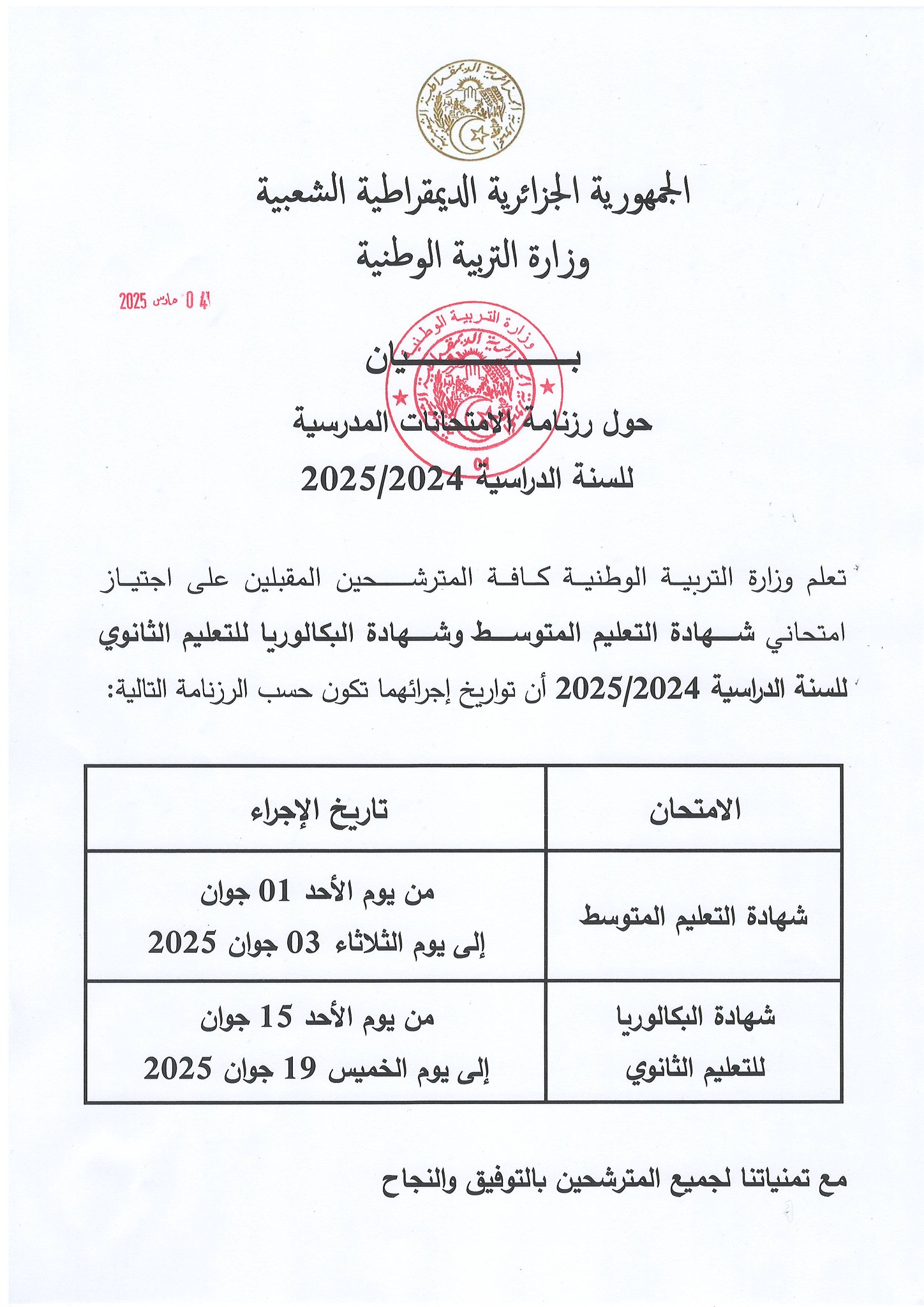 وحددت الوزارة في بيان لها، تاريخ اجتياز شهادة التعليم المتوسط من يوم الأحد 01 جوان إلى يوم الثلاثاء 03 جوان 2025.