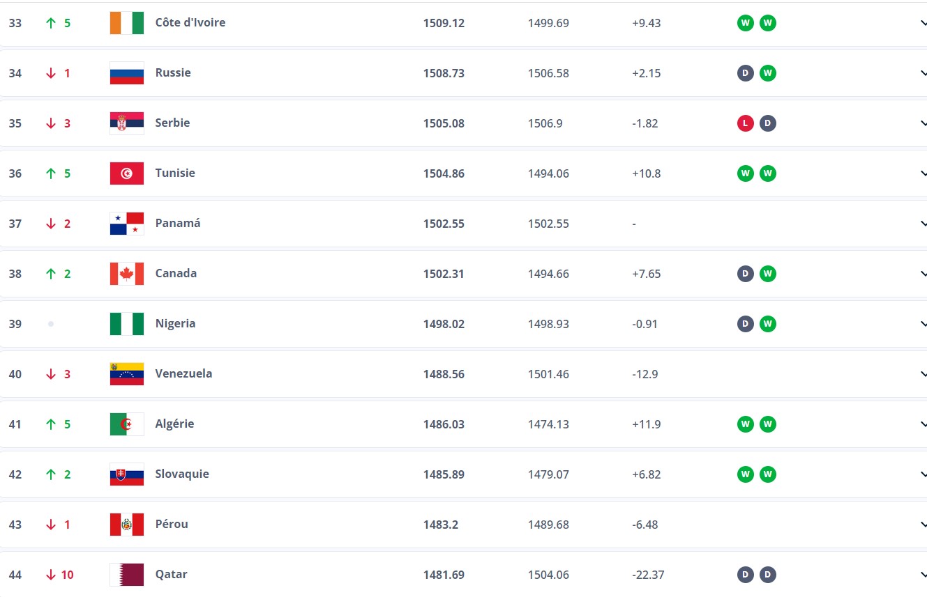 وارتقت منتخبات مصر وكوت ديفوار وتونس بدورها بخمسة مراكز في الترتيب العالمي، وتراجعت السنغال بمركزين.