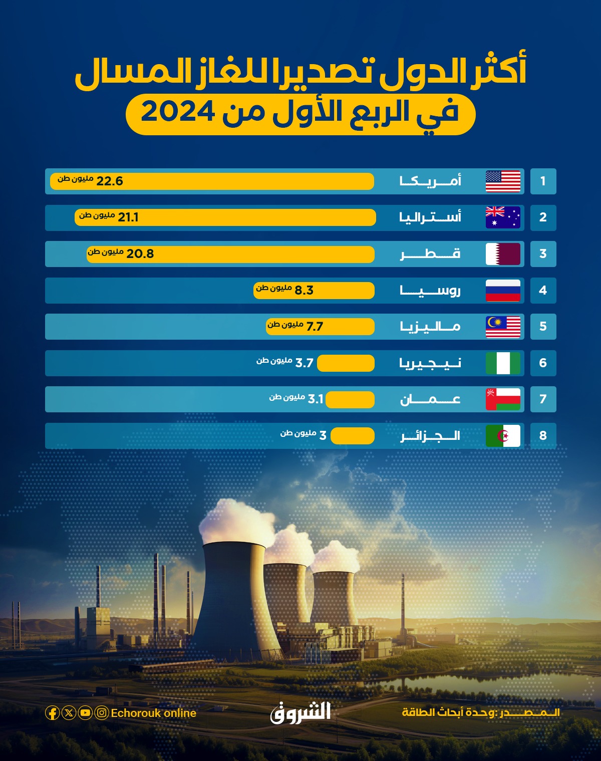 هذا هو ترتيب الدول الأكثر تصديرا للغاز المسال في الربع الأول من 2024