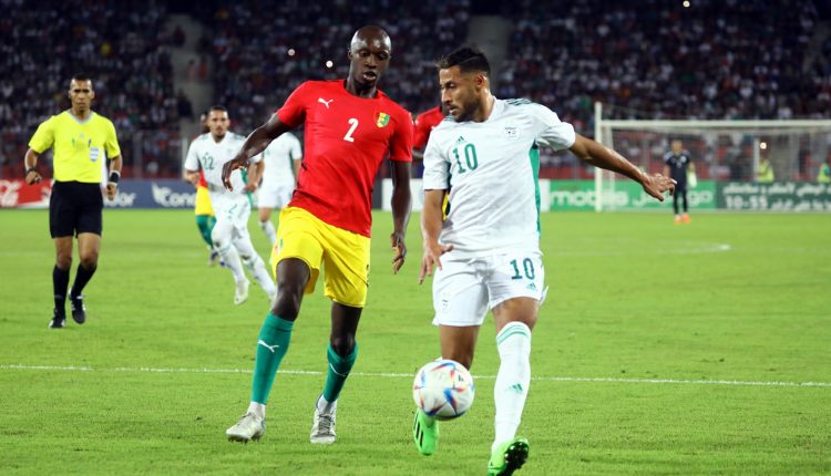 الحكم الموريتاني دحان بيدة (الثاني من اليمين/ دون احتساب اللاعب) في مباراة الجزائر وغينيا كوناكري.
