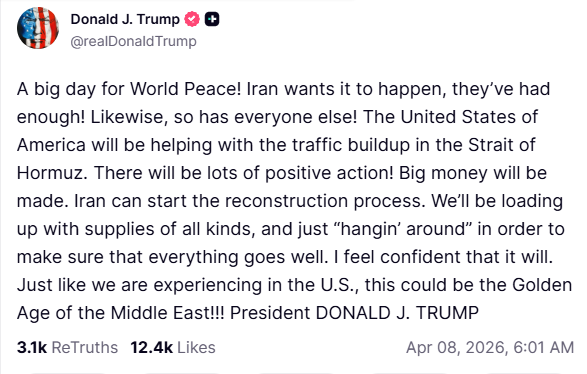 وقال في منشور عبر منصته “تروث سوشيال”: “يومٌ عظيمٌ للسلام العالمي. إيران تتوق إليه، فقد طفح كيلها وكذلك الجميع. ستساعد الولايات المتحدة الأمريكية في تخفيف الازدحام المروري في مضيق هرمز، وستكون هناك تحركات إيجابية كثيرة، وستُجنى أموال طائلة”.