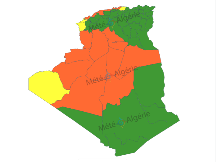 مصالح الديوان الوطني للأرصاد الجوية الجزائرية، تضع تنبيه من المستوى الأول باللون الأصفر، خاص بارتفاع محسوس في درجة الحرارة يميز اليوم الولايات التالية: