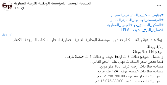 كشفت المؤسسة الوطنية للترقية العقارية يوم الخميس، عن القائمة الكاملة لأسعار السكنات المعروضة في عملية بيع كبرى، بصيغة الترقوي الحرّ (LPL).