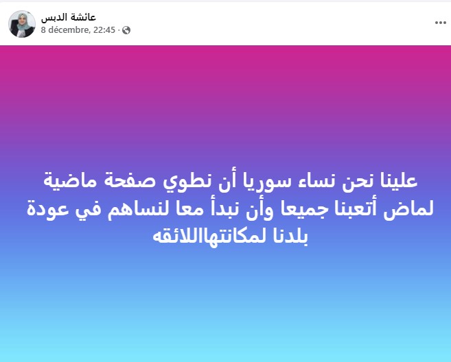 كتبت عبر حسابها على فيسبوك فور سقوط نظام الأسد أنه يتعين “على نساء سوريا المساهمة في عودة بلدهن لمكانتها اللائقة”.