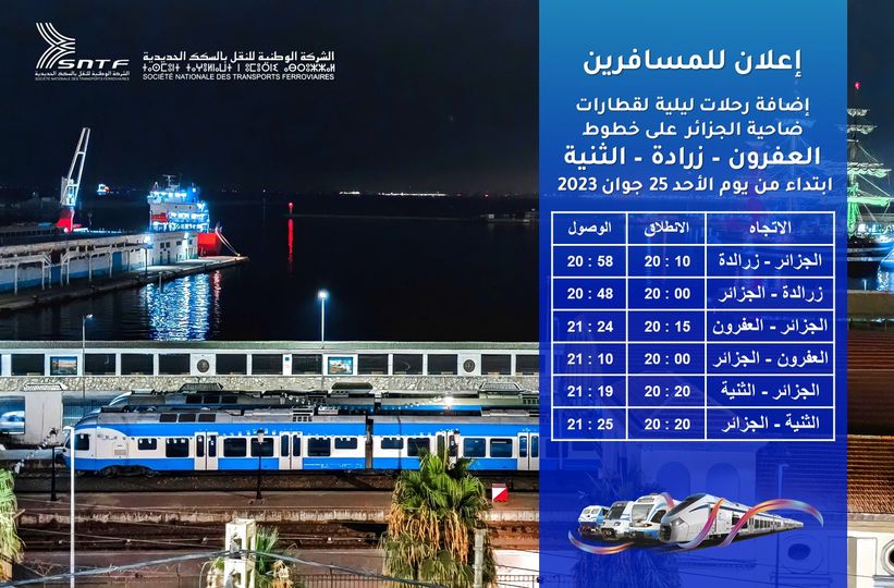 وأفاد بيان شركة النقل بالسكك الحديدية عن إضافة رحلات ليلية على خطوط العفرون، زرالدة والثنية. ابتداءً من 25 جوان حسب البرنامج الآتي: