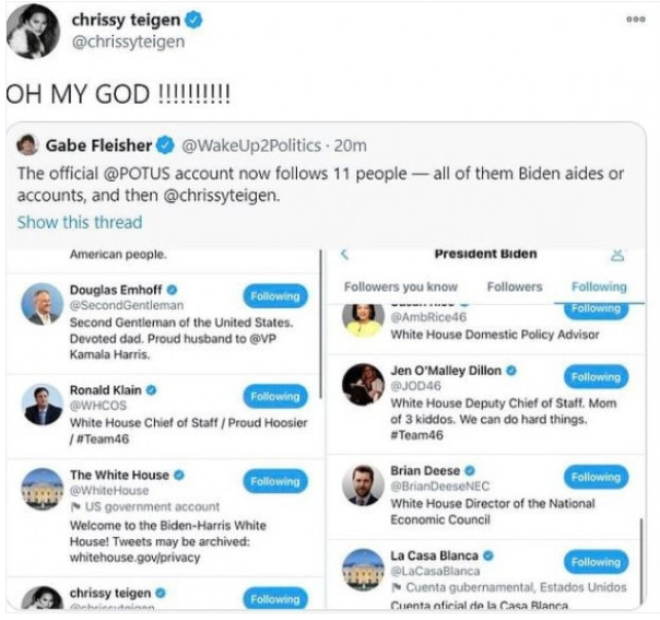 وقال متابعون إن بايدن أضاف عارضة الأزياء الأمريكية كريسي تيجن “35 سنة” لسبب مهم لأنه انتقائي جدا فمن بين 5 ملايين متابع له، يوجد بقائمته 10 شخصيات فقط أغلبهم من رجال السياسية والإداريين والأقارب.
