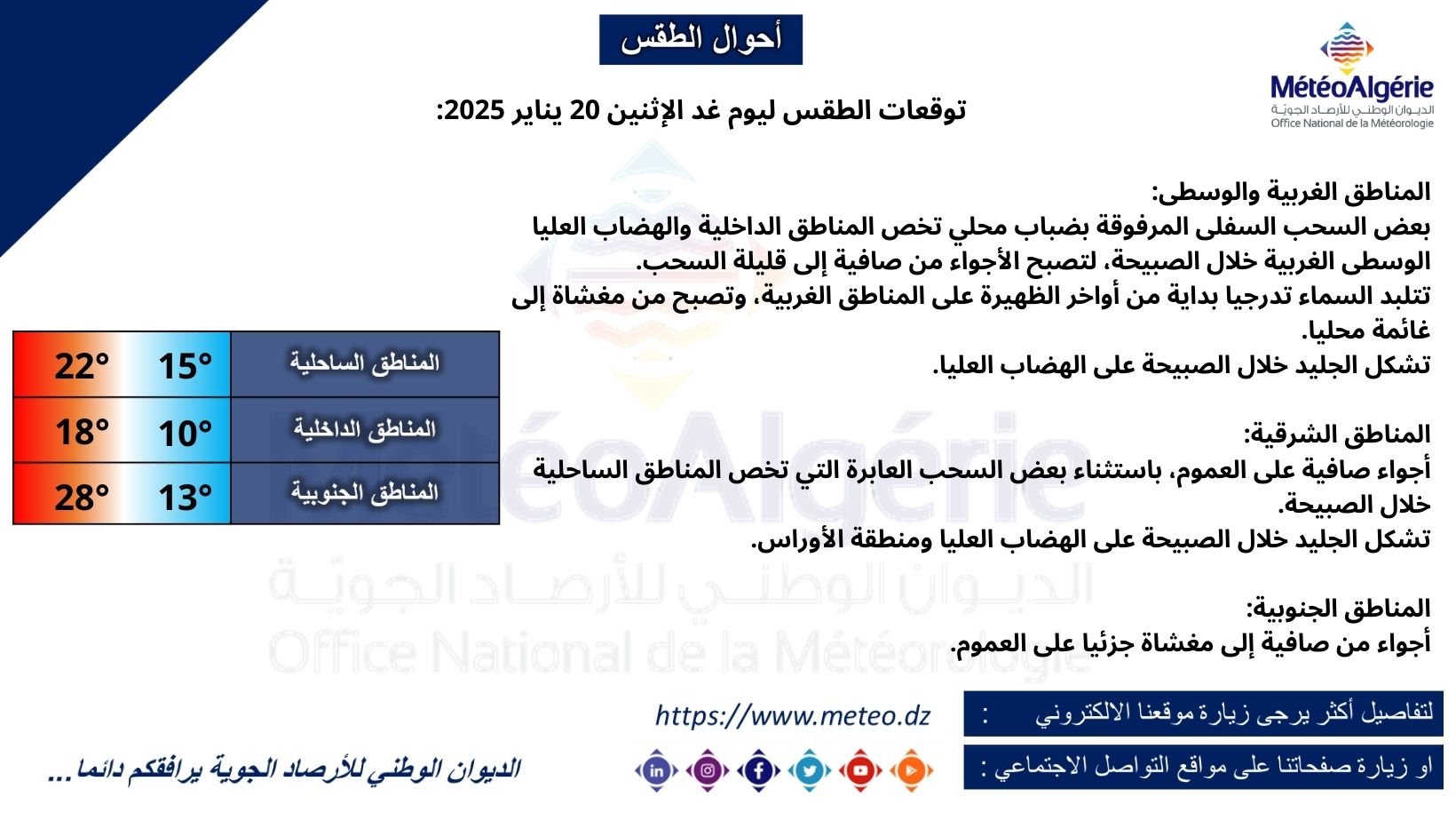 أصدر الديوان الوطني للأرصاد الجوية توقعاته لحالة الطقس لليوم الإثنين، حيث من المتوقع عبور سحب مرفوقة بضباب محلي على المناطق الغربية وأجواء صافية على العموم على المناطق الشرقية للبلاد مع تسجيل أجواء من صافية إلى مغشاة جزئياً على العموم على المناطق الجنوبية.