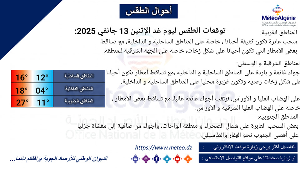 أصدر الديوان الوطني للأرصاد الجوية توقعاته لحالة الطقس ليوم غد الإثنين، حيث من المتوقع عبور سحب قد تكون محملة ببعض الأمطار على المناطق الغربية وأجواء غائمة وباردة على المناطق الساحلية والداخلية للبلاد مع تسجيل أجواء مستقرة على شمال الصحراء ومنطقة الواحات.