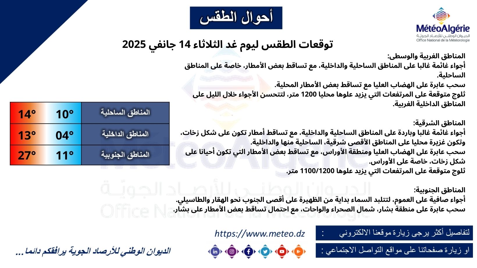- سحب عابرة على منطقة بشار، شمال الصحراء والواحات، مع احتمال تساقط بعض الأمطار على بشار.