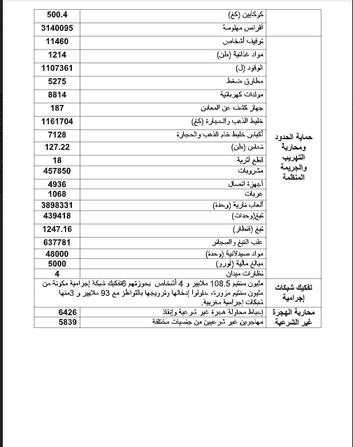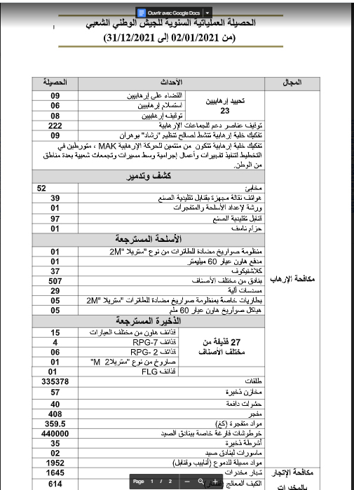 ويظهر الجدول المرفق الحصيلة العملياتية السنوية للجيش الوطني الشعبي: