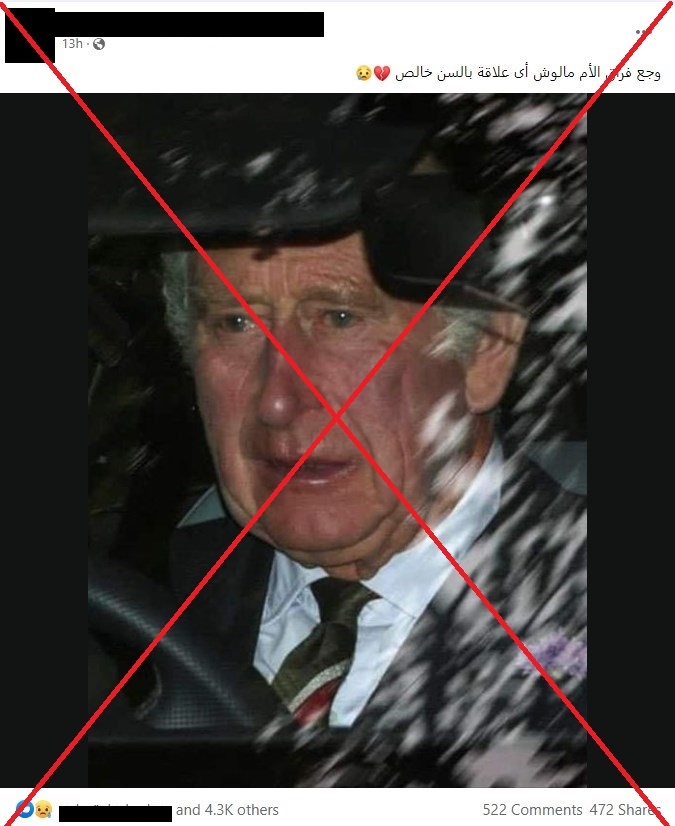 تداولت صفحات وحسابات على مواقع التواصل الاجتماعي صورة للملك البريطاني تشارلز المنصب وهو يبكي تزعم بأن الصورة ملتقطة بعد رحيل والدته الملكة إليزابيث الخميس.