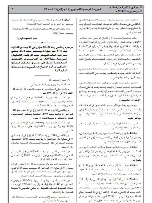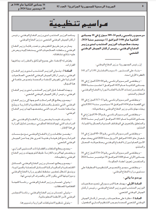 صدر في العدد الأخير (82) من الجريدة الرسمية في صفحتها الثامنة مرسوماً رئاسياً برقم 24-389 أمضاه رئيس الجمهورية ووزير الدفاع الوطني، عبد المجيد تبون، يحدد فيه الصلاحيات الممنوحة للوزير المنتدب لدى وزير الدفاع الوطني، رئيس أركان الجيش الوطني الشعبي.