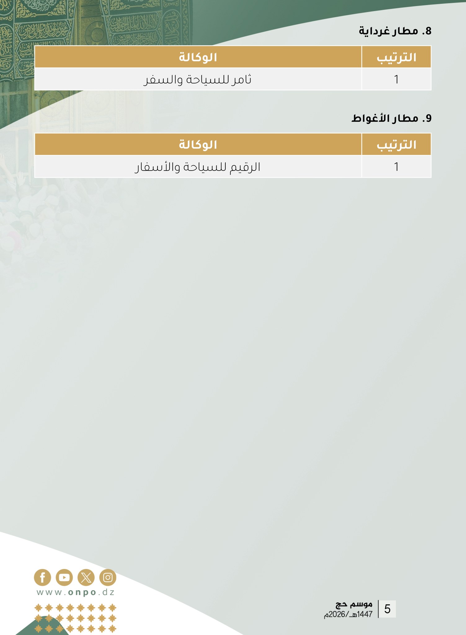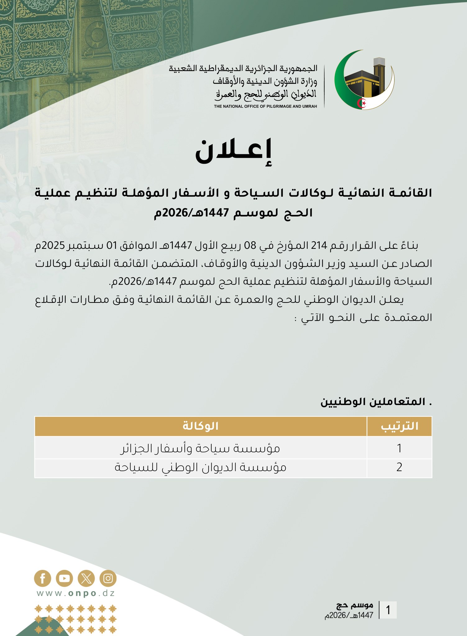 أعلن الديوان الوطني للحج والعمرة، أمس الاثنين، عن القائمة النهائية لوكالات السياحة والأسفار المؤهلة لتنظيم عملية الحج لموسم 1447هـ/2026م، والتي تضم 48 وكالة إلى جانب متعاملين وطنيين اثنين.