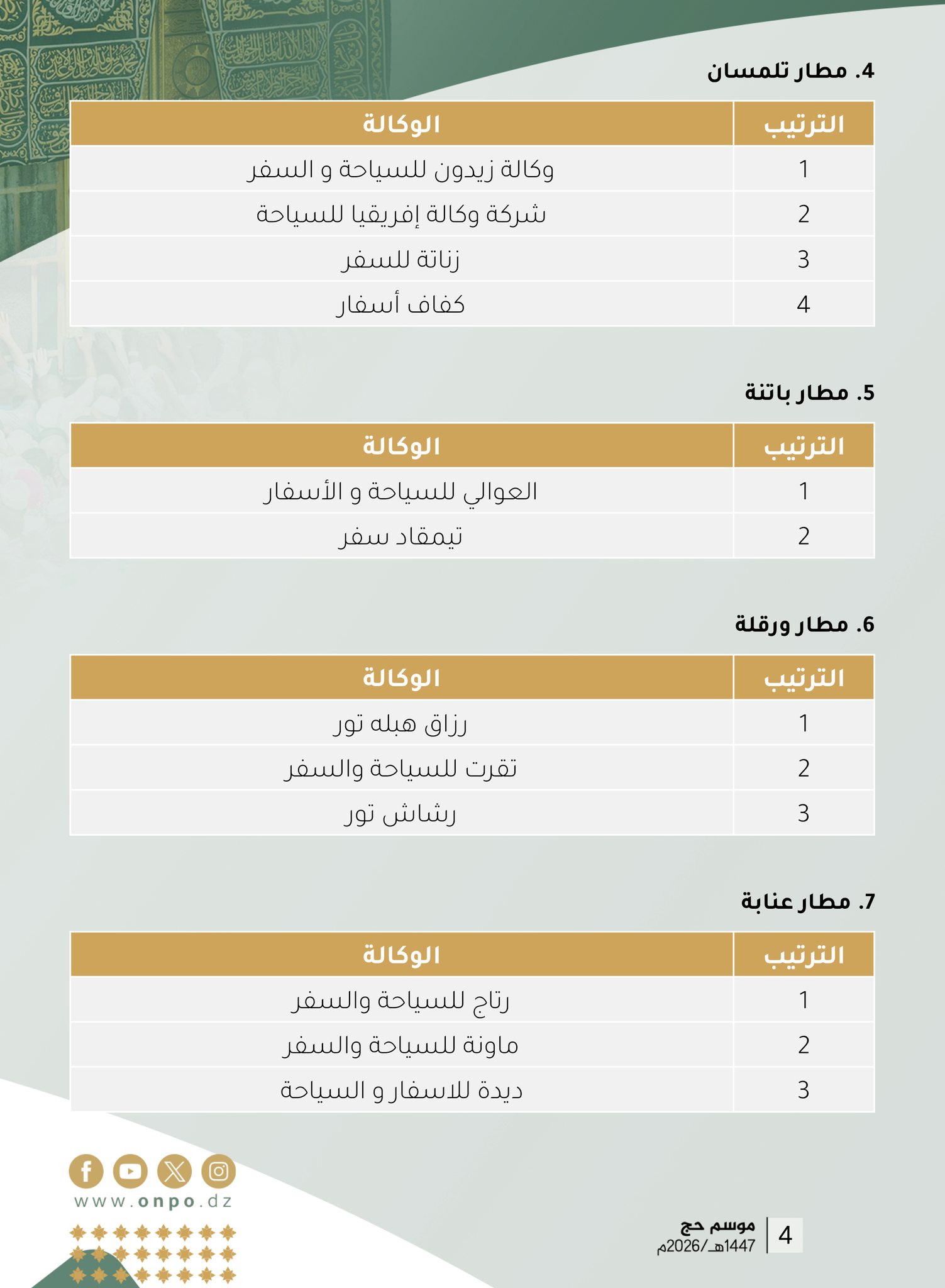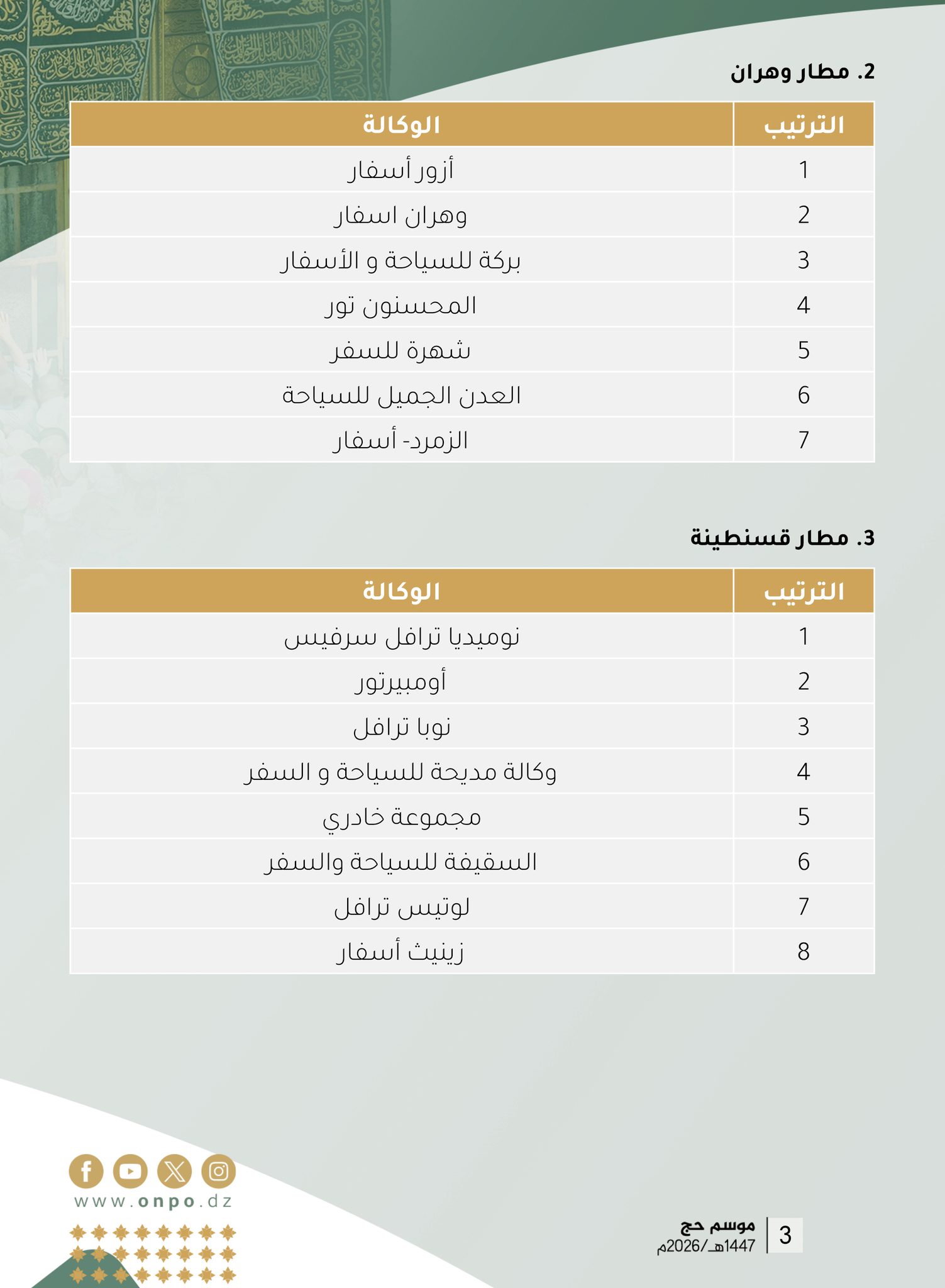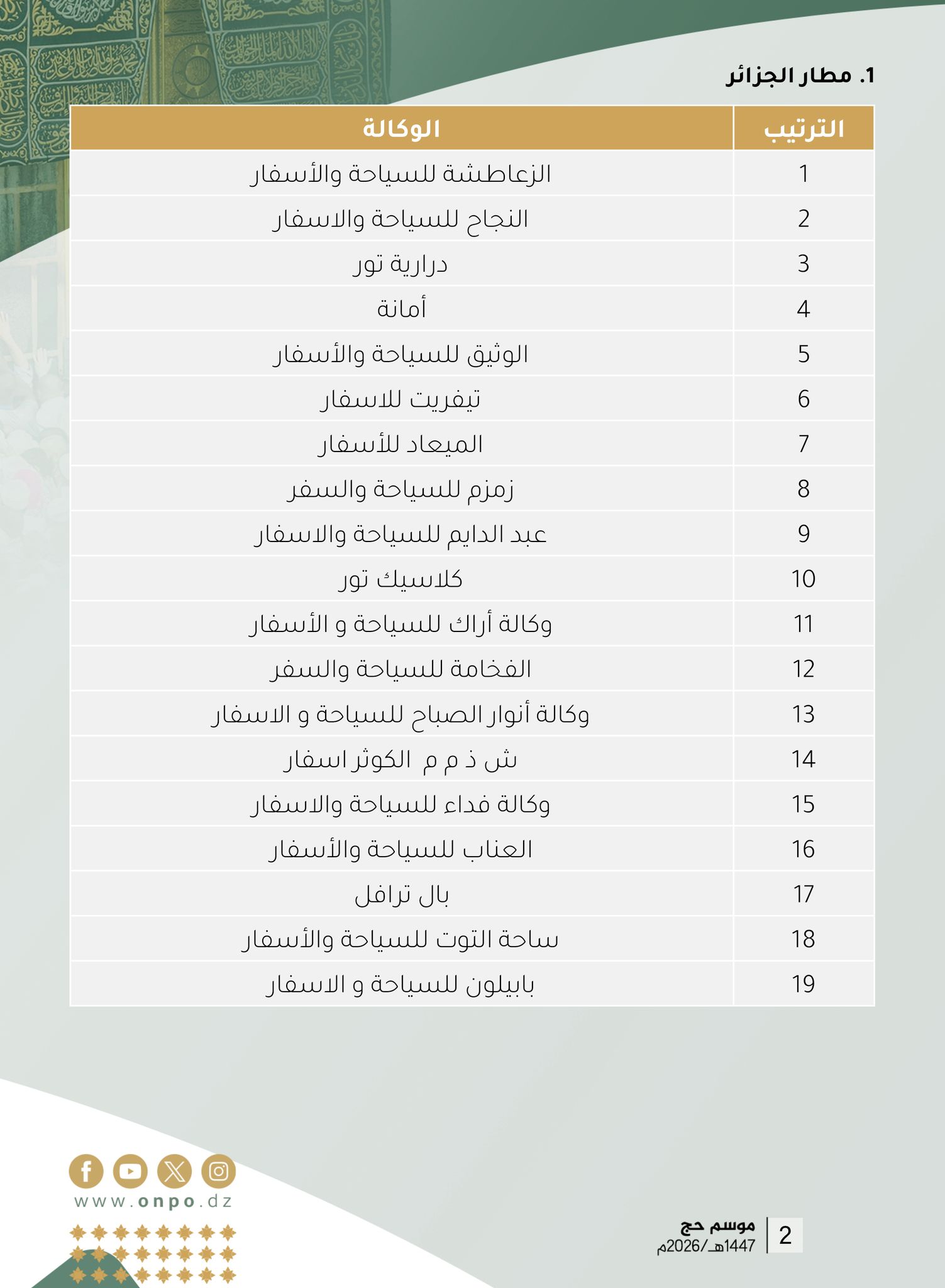 وتشمل القائمة إلى جانب الوكالات المعتمدة، كلا من “مؤسسة سياحة وأسفار الجزائر” و”مؤسسة الديوان الوطني للسياحة”، باعتبارهما من المتعاملين الوطنيين المكلفين بالمشاركة في تنظيم الموسم القادم.