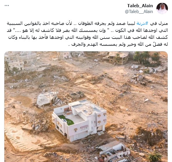 تداول ناشطون عبر شبكات التواصل الاجتماعي مقطعا مصورا لـ “المنزل المعجزة” الذي بقي صامدا في وجه الفيضانات التي اجتاحت مدينة درنة الليبية.