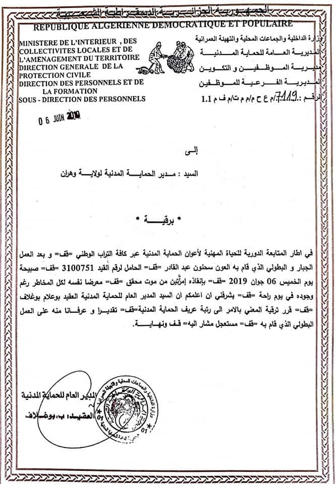 وتجاوبا مع العمل البطولي الذي قام به العون عبد القادر سحنون، قام والي ولاية وهران بتكريمه رفقة أعوان الحماية الآخرين، كما أن المعني تلقى لفتة بارزة من المدير العام للحماية المدنية، العقيد بوعلام بوغلاف، الذي خصه ببرقية تهنئية، وايضا قام بإصدار قرار ترقية العون إلى رتبة عريف في الحماية المدنية، كما قرر المدير العام للحماية المدنية وتكريما للعون سحنون عبد القادر إدراجه السنة القادمة ضمن مفرزة الحماية المدنية، التي تعمل ضمن بعثة الحج الجزائرية.