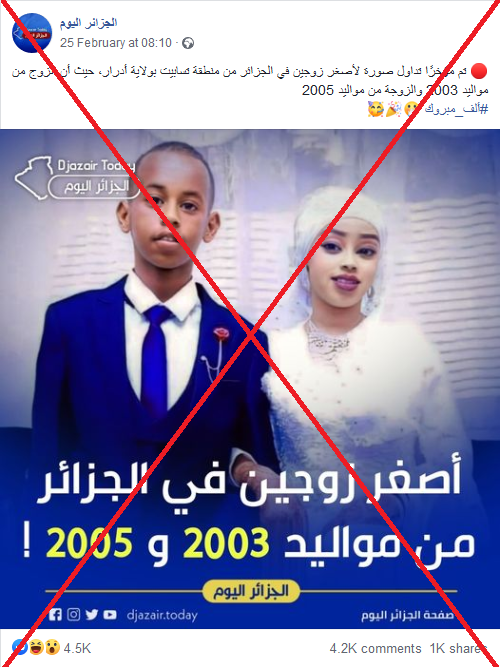 تداول مستخدمون لمواقع التواصل الاجتماعي، صورة يدّعي ناشروها بأنّها لأصغر زوجين في الجزائر من منطقة أدرار. لكنّ الادعاء غير صحيح والصورة تعود لزوجين من جمهورية أرض الصومال.