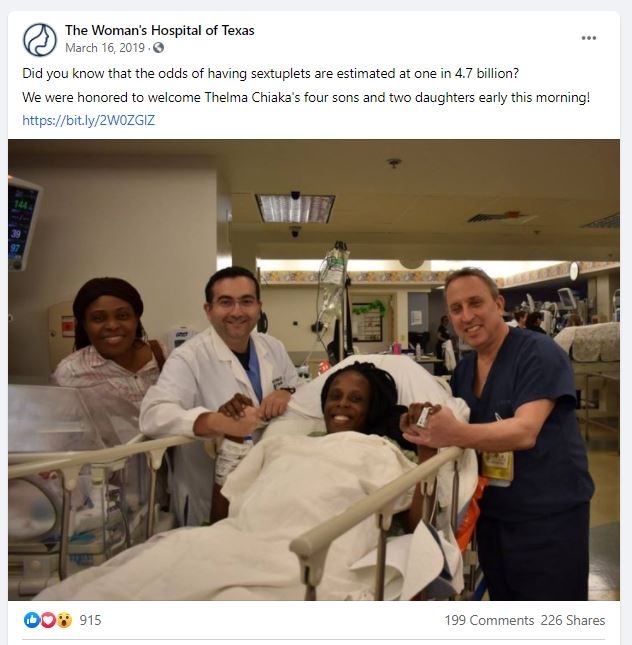 وجاء في التعليق المرفق أن أن شابة تدعى Thelma Chiaka أنجبت 6 توائم في 15 مارس 2019 في أحد مستشفيات ولاية تكساس الأميركية. ونسبت الصورة إلى صفحة The Woman’s Hospital of Texas على موقع فيسبوك والتي بالفعل نشرت الصورة على حسابها.
