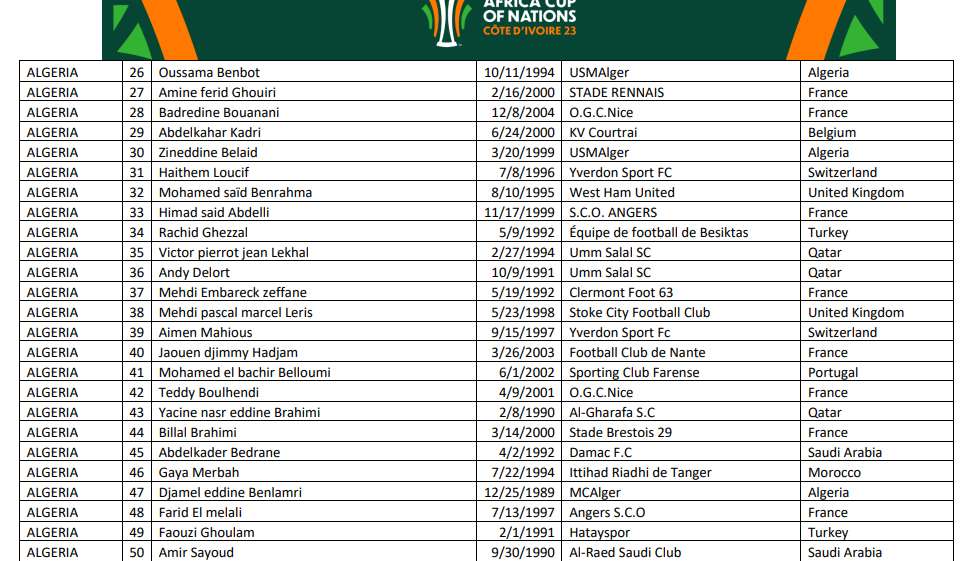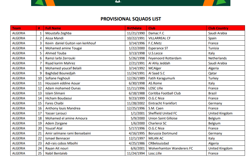 كشف الاتحاد الإفريقي لكرة القدم عن القائمة الموسعة للمنتخب الجزائري، تحسبا لكأس أمم إفريقيا كوت ديفوار 2023 .