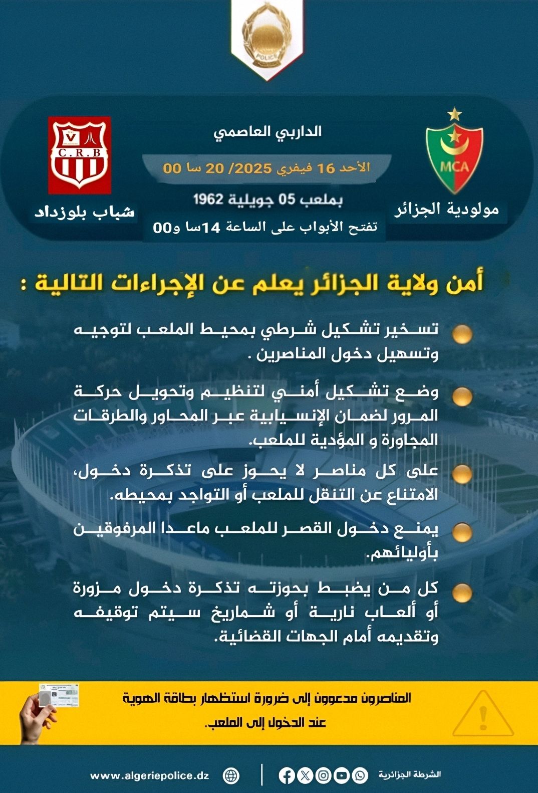 أصدرت شرطة العاصمة بيانا، بخصوص الإجراءات والتدابير المتخذة لتأمين مباراة الدور الـ16 من كأس الجزائر، بين شباب بلوزداد ومولودية الجزائر.