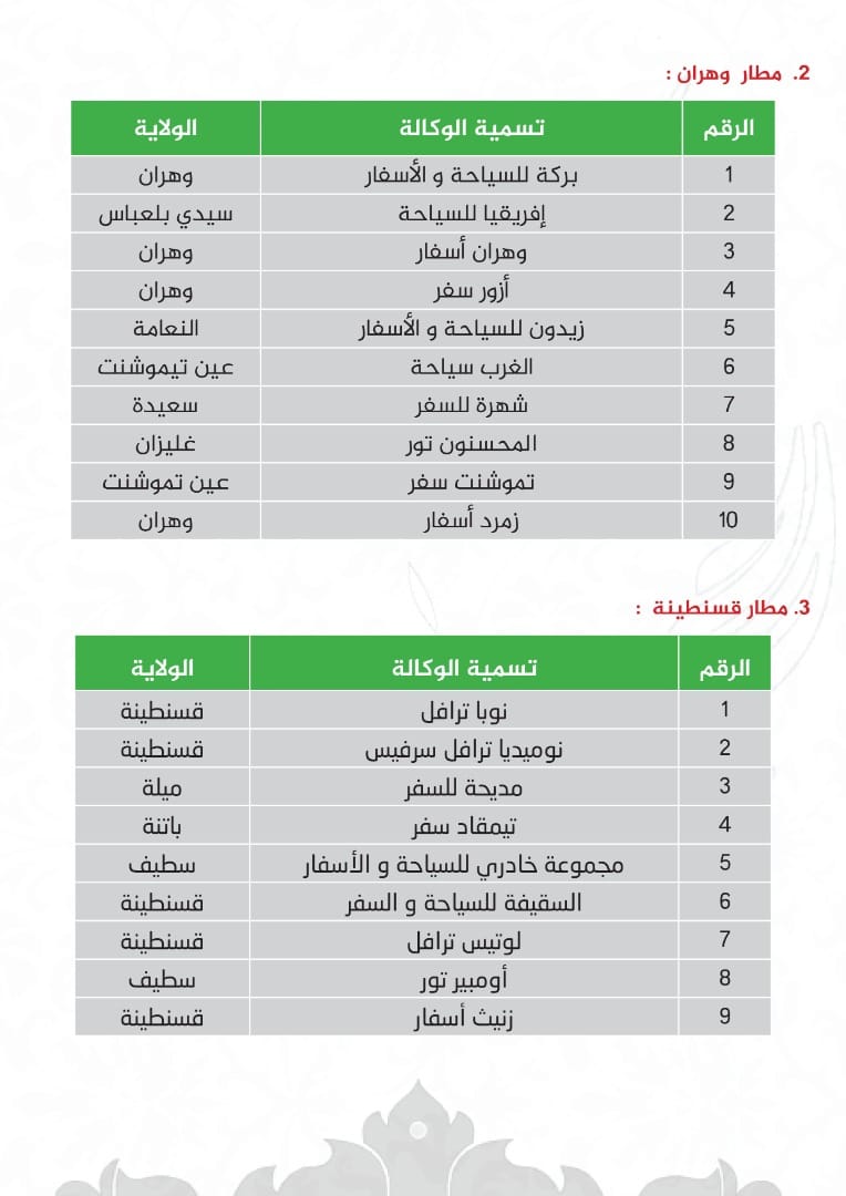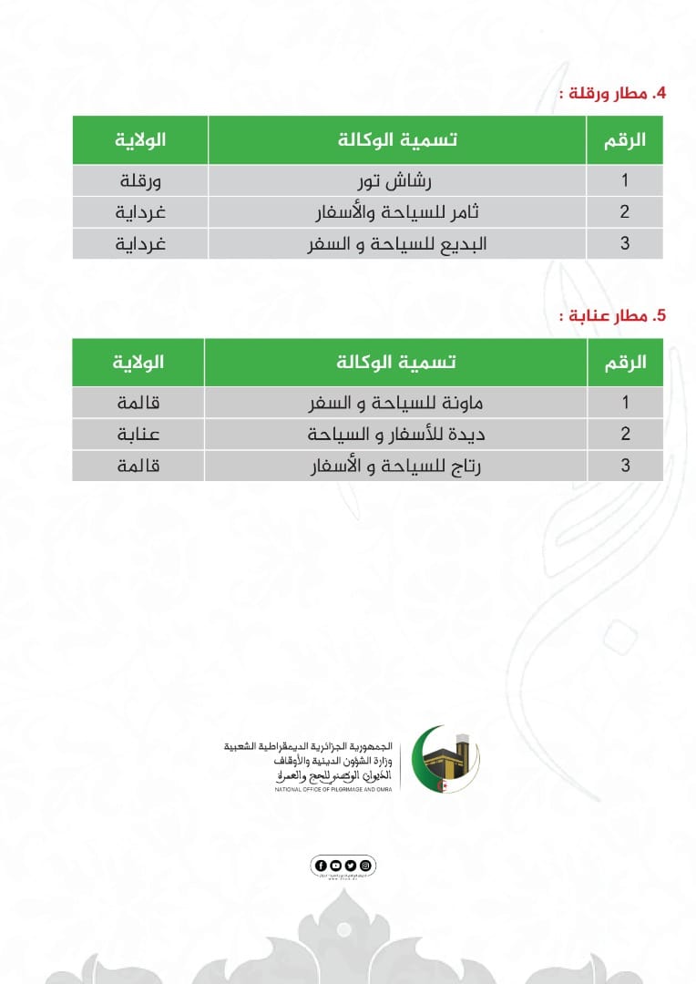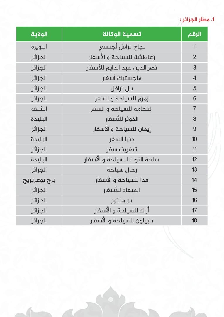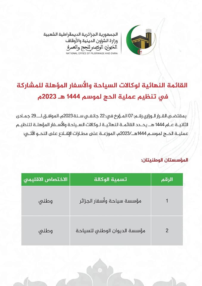 أفرج الديوان الوطني للحج والعمرة عن قائمة الوكالات السياحية المؤهلة للمشاركة في تنظيم موسم الحج 2023 والموزعة عبر مطارات الإقلاع.