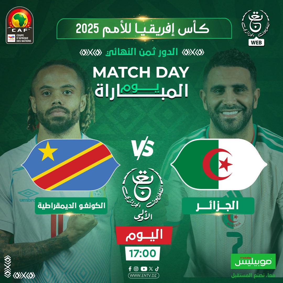 يخوض المنتخب الوطني الجزائري لكرة القدم، اليوم الثلاثاء، مواجهة حاسمة أمام منتخب جمهورية الكونغو الديمقراطية، بداية من الساعة 17:00، ضمن الدور ثمن النهائي من كأس أمم إفريقيا 2025، بطموح واضح يتمثل في بلوغ الدور ربع النهائي ومواصلة المشوار القاري.