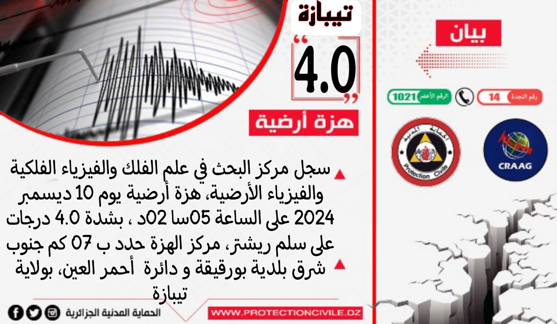 هزة أرضية بقوة 4.0 درجات تضرب جنوب شرق بوركيكة بتيبازة