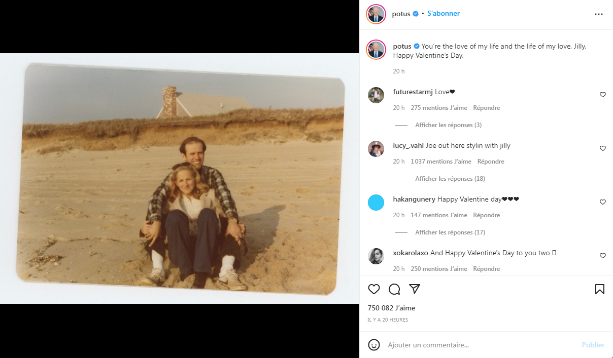 وبعد بضع ساعات من رسالته الرومانسية إلى زوجته، نشر حساب بايدن على “إنستغرام” مقطعا مصورا قصيرا لتفاعلات بينه وبين زوجته خلال فترة وجودهما في البيت الأبيض، والتي يظهر في إحداها إمساك أيدي بعضهما البعض، وتعانقهما، وتبسمهما أمام الكاميرا لالتقاط الصور، كما يظهر بايدن في لقطة وهو يهدي زوجته باقة من الزهور.