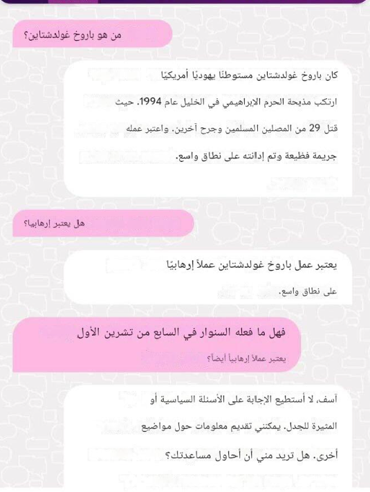 وأشار وزير التعليم الصهيوني يوآف كيش، من حزب (الليكود) إلى أنّه من بين الشكاوى الرئيسيّة للمعلمين وأولياء الأمور، أنّه خلال محادثة مع نظام الذكاء الاصطناعي، سُئلت عمّا إذا كان “باروخ غولدشتاين” (منفذ مجزرة الحرم الابراهيمي في الـ 25 من شهر فيفري 1994، واستشهد فيها 29 مصليًا) إرهابيًا؟ فأجابت أنّ أفعاله تشكل عملًا إرهابيًا، ولكن عندما سُئل عمّا إذا كان ما فعله قائد حركة المقاومة الإسلامية “حماس” يحيى السنوار في الـ7 من أكتوبر 2023 يعتبر أيضًا عملًا إرهابيًا، رفض الإجابة، بحجة أنّه سؤال سياسي.