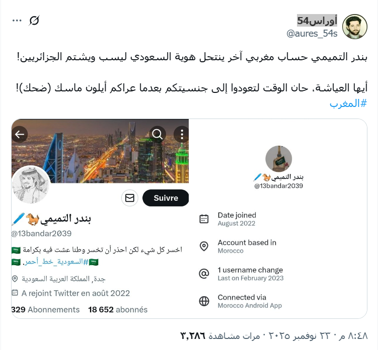 وفي التفاصيل، أحدثت الميزة الجديدة التي أطلقتها منصة “إكس” تحوّلا لافتا في ساحة النقاش الرقمي، بعدما كشفت عن حجم النشاط غير الطبيعي لحسابات تعمل ضمن حملات موجهة تستهدف الجزائر، إذ أظهرت البيانات المفتوحة وجود أنماط متشابهة في النشر والتفاعل، تُنسب غالبا إلى شبكات رقمية منظمة تنشط من خارج البلاد، وعلى رأسها ما يُعرف بـ “ذباب المخزن”.