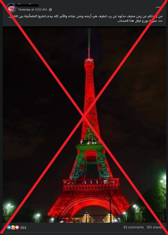 وبحسب تقرير حول صحة الأخبار نشرته وكالة فرانس برس فإن الادعاء غير صحيح وبرج إيفل أطفأ أنواره تضامناً مع الشعب المغربي، أما الصورة المتداولة فهي مركّبة.