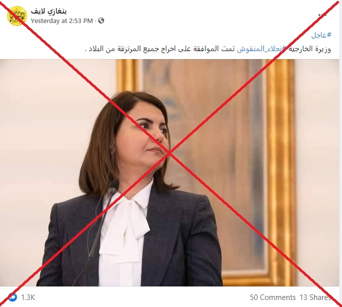 في ظلّ المطالبات المحليّة والدولية بانسحاب القوات الأجنبية من ليبيا، تناقلت صفحات على مواقع التواصل باللغة العربية تصريحاً حديثاً منسوباً لوزيرة الخارجية الليبية نجلاء المنقوش يعلن “البدء رسمياً بإخراج كلّ المرتزقة من البلاد”. لكن أي تصريح مماثل لم يصدر حديثاً عنها.