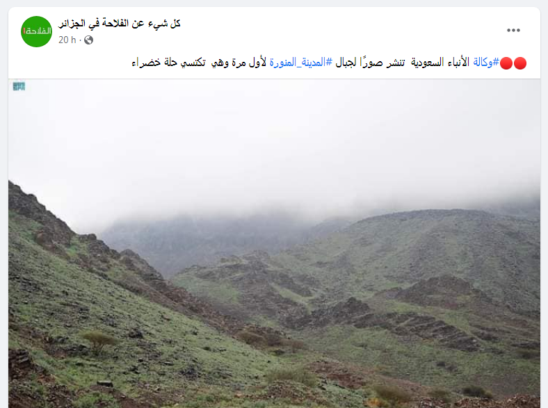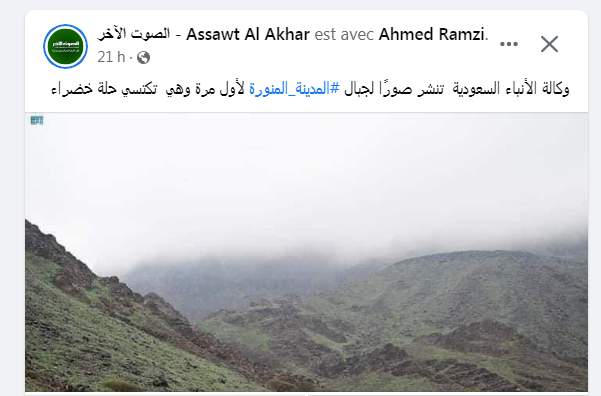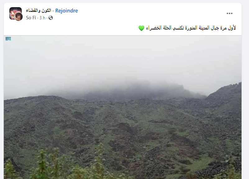 أصبحت عبارة “جبال المدينة” بين الأكثر بحثا على فيسبوك يوم الأربعاء. والسبب هو تداول منشورات تدّعي أنّ جبال هذه المنطقة السعودية، قد أصبحت مكسوة بالعشب الأخضر “للمرة الأولى”، بعد سقوط كمية كبيرة من الأمطار في البلاد.