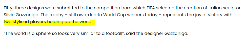 الموقع الرسمي للفيفا: “تمثل الكأس التي تُمنح للفائزين بكأس العالم حتى اليوم، فرحة النصر، مع لاعبين منحوتين وهما يرفعان العالم”.