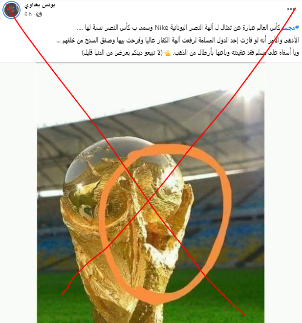 تداول مستخدمون على مواقع التواصل الاجتماعي صورة ومنشورات، مفادها أن مجسّم كأس العالم لكرة القدم، يتضمّن شكل آلهة يونانية في المعتقدات الوثنية القديمة.