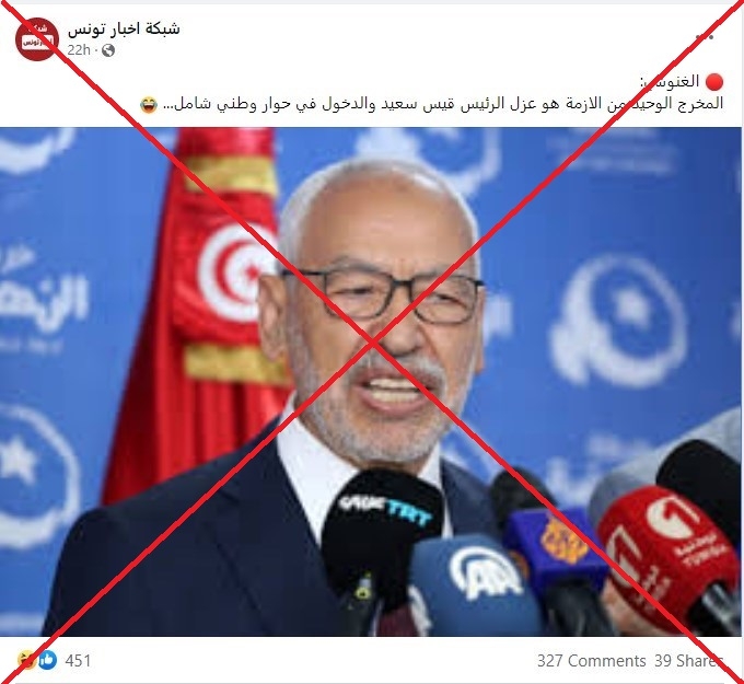 لكن التصريح المنسوب للغنوشي غير صحيح، فتعليقاً على إعلان قيس سعيّد أصدر راشد الغنوشي بياناً تضمّن بنوداً “للخروج من الأزمة”، منها “الإلغاء الفوري للإجراءات الاستثنائيّة والدخول في حوار وطنيّ”.