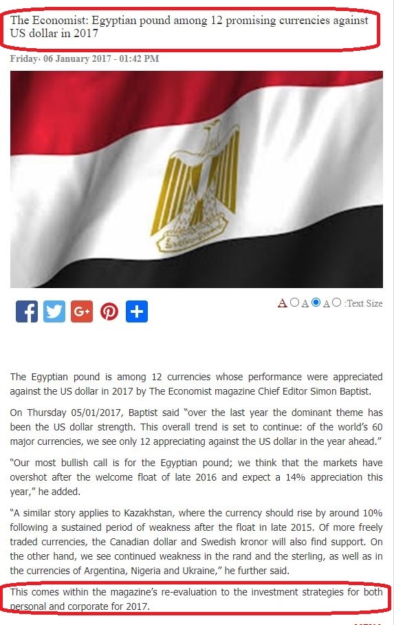 ويفصّل المقال أنّ رئيس تحرير مجلّة الإيكونوميست سيمون باتيست قال في الخامس من ديسمبر2017 إنّه من بين أبرز 60 عملة حول العالم، 12 منها فقط ستسجّل تقدماً مقابل الدولار الأمريكي من بينها الجنيه المصري، متوقعاً أن ترتفع قيمته بنسبة 12%”.