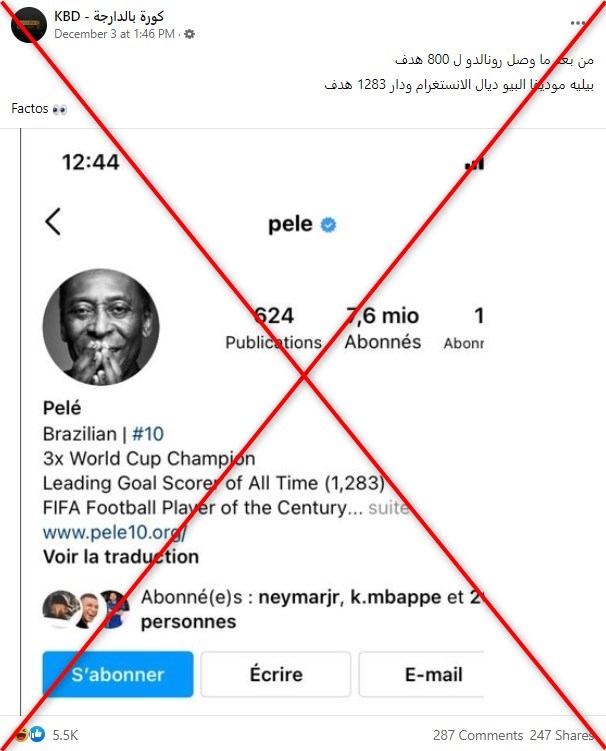 بعد أنّ سجّل اللاعب البرتغالي كريستيانو رونالدو هدفه الـ801، زعم مستخدمون لمواقع التواصل الاجتماعي أنّ اللاعب البرازيلي بيليه عدّل عدد الأهداف المذكورة في تعريفه الشخصيّ على موقع إنستغرام لتصبح 1283، فما صحة ذلك؟