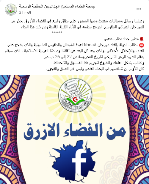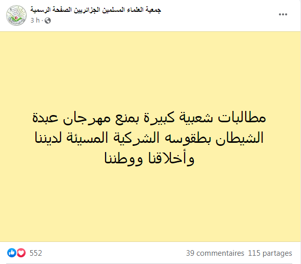 في ذات السياق ناشد الكثيرون جمعية العلماء المسلمين أن تتدخل لوقف المهزلة، وطالبوا العلماء والشيوخ بتجريم ما أسموه بمهرجان الفسق والانحطاط، لافتين أن الأولى منافسة الغرب في البحث العلمي وليس في الشذوذ والفجور.