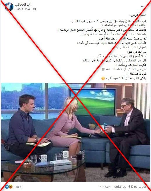 أظهرت الصورة التي يتم تداولها منذ سنوات بالعديد من لغات العالم بما فيها العربية، مذيعة أحد البرامج وهي مترددة في استلام شيك من مؤسس مايكروسوفت.