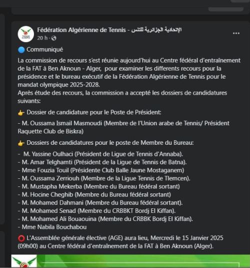 ولكن بعيدا عن الغمار الانتخابي، بدا وأن الاتحادية الجزائرية لرياضة التنس تُخاطب الجمهور الفرنسي العاشق لِرياضة الكرة الصفراء! كيف لا والبيان الذي نشرته حُرّر بِلغة “موليير”!؟ (المنشور المدرج أدناه).