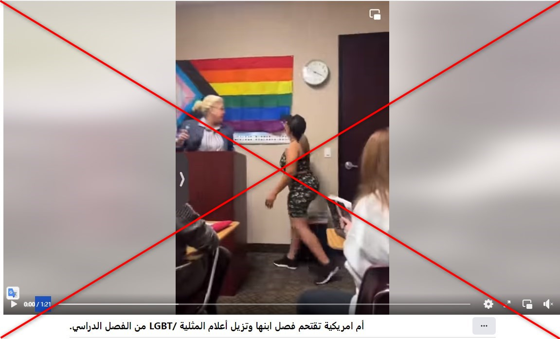 تداول ناشطون عبر مواقع التواصل الاجتماعي مقطع فيديو، يدّعي ناشروه أنّه يصوّر والدة أحد الطلاب في الولايات المتحدة وهي تمزّق علم المثليين داخل فصل دراسي.