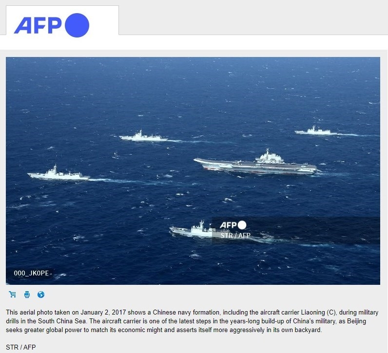 وقال فريق فرانس برس أن الصورة سبق أن وزّعتهاوكالة فرانس برس مطلع العام 2017، وجاء في التعليق المرافق لها أنّها تظهر حاملة طائرات خلال مناورة للبحريّة الصينيّة في بحر الصين الجنوبيّ.