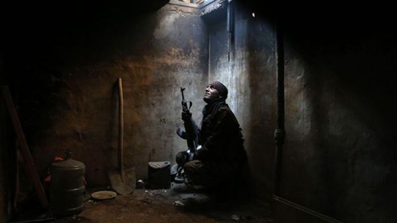 مقاتل من "فيلق الرحمن" يتحصن في أحد المواقع في عربين قرب دمشق - 30 جانفي 2016