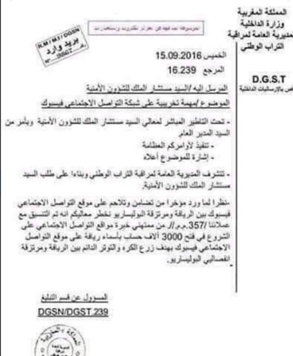 وجاء في وثيقة المديرية العامة لمراقبة التراب الوطني المغربية التابعة لوزارة الداخلية, الموقعة من المسؤول على قسم التبليغ بتاريخ 15 اكتوبر 2016، أنه: “نظرا لما ورد مؤخرا من تضامن وتلاحم على موقع التواصل الاجتماعي فايسبوك بين الريافة والبوليساريو (…) تم التنسيق مع عملائنا من ممتهني خبرة مواقع التواصل الاجتماعي من أجل الشروع في فتح 3000 حساب بأسماء ريافة على فايسبوك بهدف زرع الكره والتوتر الدائم” بين الريافة والبوليساريو.