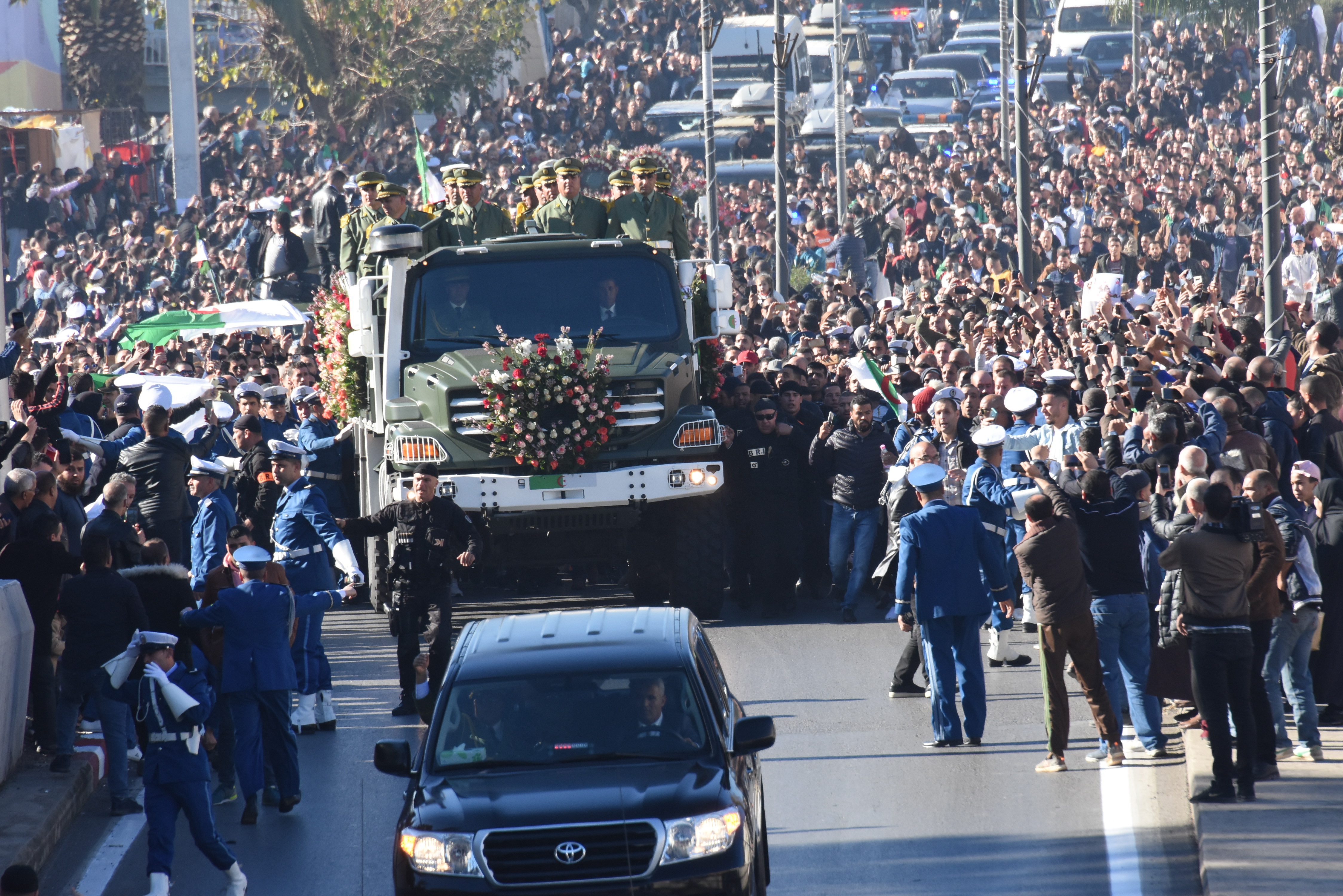 بعد نصف ساعة تقريبا، وصل الموكب الجنائزي، الذي كانت تتقدمه سيارات سوداء لأفراد البحث والتدخل “BRI”، وبعدها المركبة التي بها نعش الراحل، ويظهر فوقها الحارس الخاص للراحل المجاهد أسد الجزائر، احمد قايد صالح، والذي رافقه إلى مثواه الأخير، بعد سنوات من المرافقة المقربة جدا، وكان الموكب الجنائزي حينها يتقدم بصعوبة شديدة وسط الآلاف الذين أرادوا تقبيل النعش، ووجد أفراد الحماية المرافقين للنعش صعوبة في إبعاد المشيعين، ومن تعذر عليه تقبيل النعش، اكتفى بأخذ الورود الموضوعة على المدرعة التي نقلت النعش.