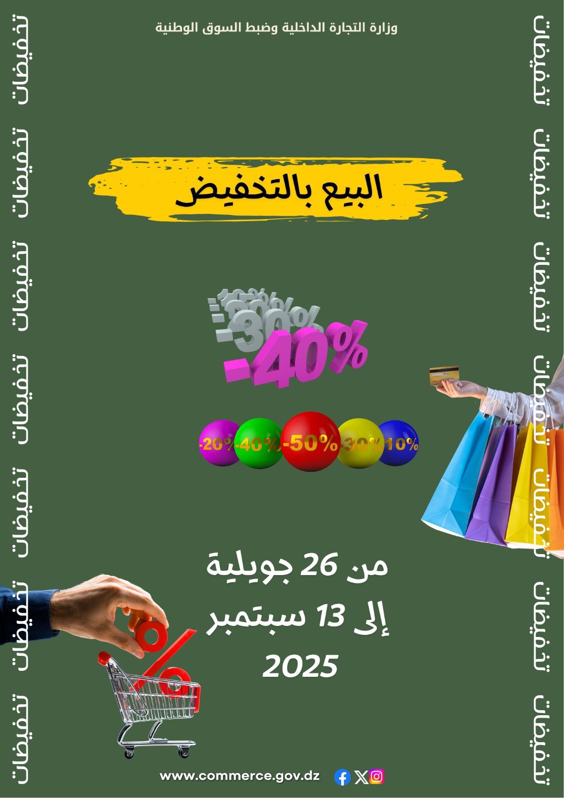 ودعت الوزارة كافة الأعوان الاقتصاديين إلى اغتنام هذه المناسبة لممارسة نشاط البيع بالتخفيض خلال الفترة المحددة، والمساهمة في إنجاحها من خلال عرض أسعار مخفضة وتنافسية تُمكن المستهلكين من اقتناء السلع والخدمات بأسعار ترويجية مناسبة.