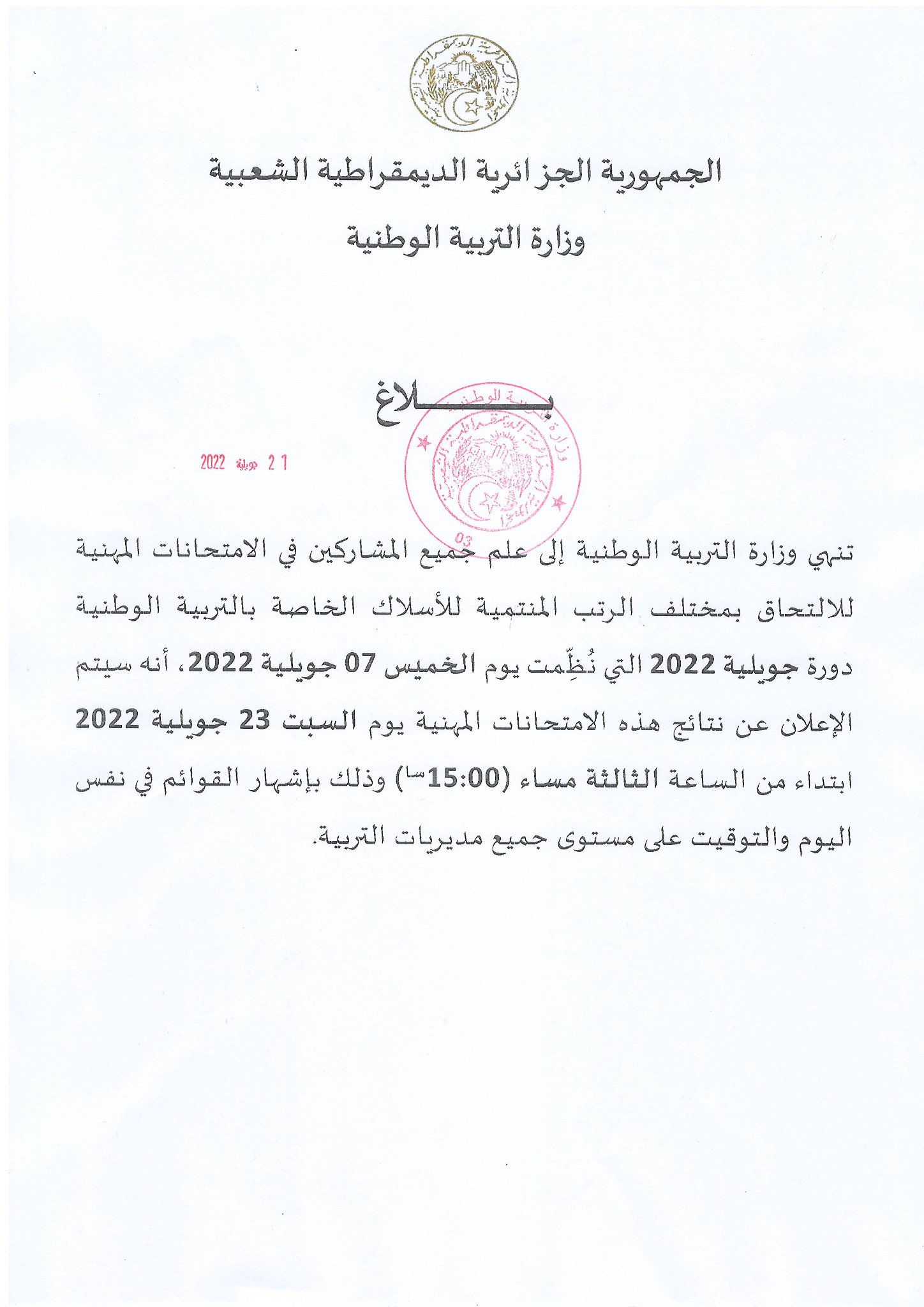 وجاء في بيان للوزارة “تنهي وزارة التربية إلى علم جميع المشاركين في الامتحانات المهنية للالتحاق بمختلف الرتب المنتمية للأسلاك الخاصة بالتربية الوطنية دورة جويلية 2022 التي نظمت يوم الخميس 7 جويلية 2022، أنه سيتم الإعلان عن نتائج هذه الامتحانات المهنية يوم السبت 23 جويلية 2022”.
