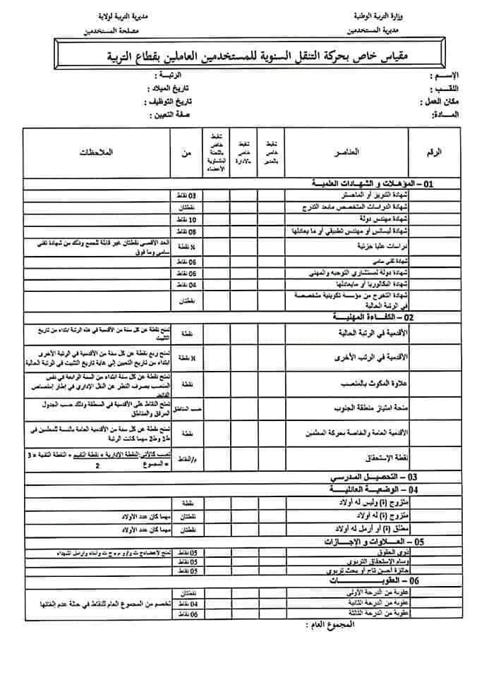 أفرجت وزارة التربية الوطنية، عن مقياس خاص بالحركة التنقلية السنوية للمستخدمين العاملين في قطاع التربية الوطنية، لكي يتسنى لهم إجراء تقييم ذاتي لأنفسهم، بالرجوع إلى “سلم التقييم” أو التقدير.