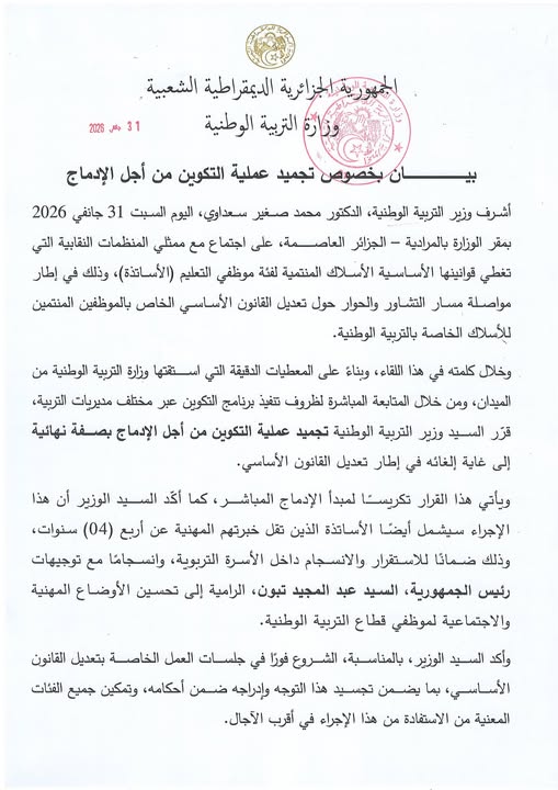 وأفاد بيان للوزارة، السبت، أن الوزير سعداوي، أكد أنه وبناءً على المعطيات الدقيقة التي استقتها وزارة التربية الوطنية من الميدان، ومن خلال المتابعة المباشرة لظروف تنفيذ برنامج التكوين عبر مختلف مديريات التربية قرر وزير التربية الوطنية تجميد عملية التكوين من أجل الإدماج بصفة نهائية إلى غاية إلغائه في إطار تعديل القانون الأساسي.